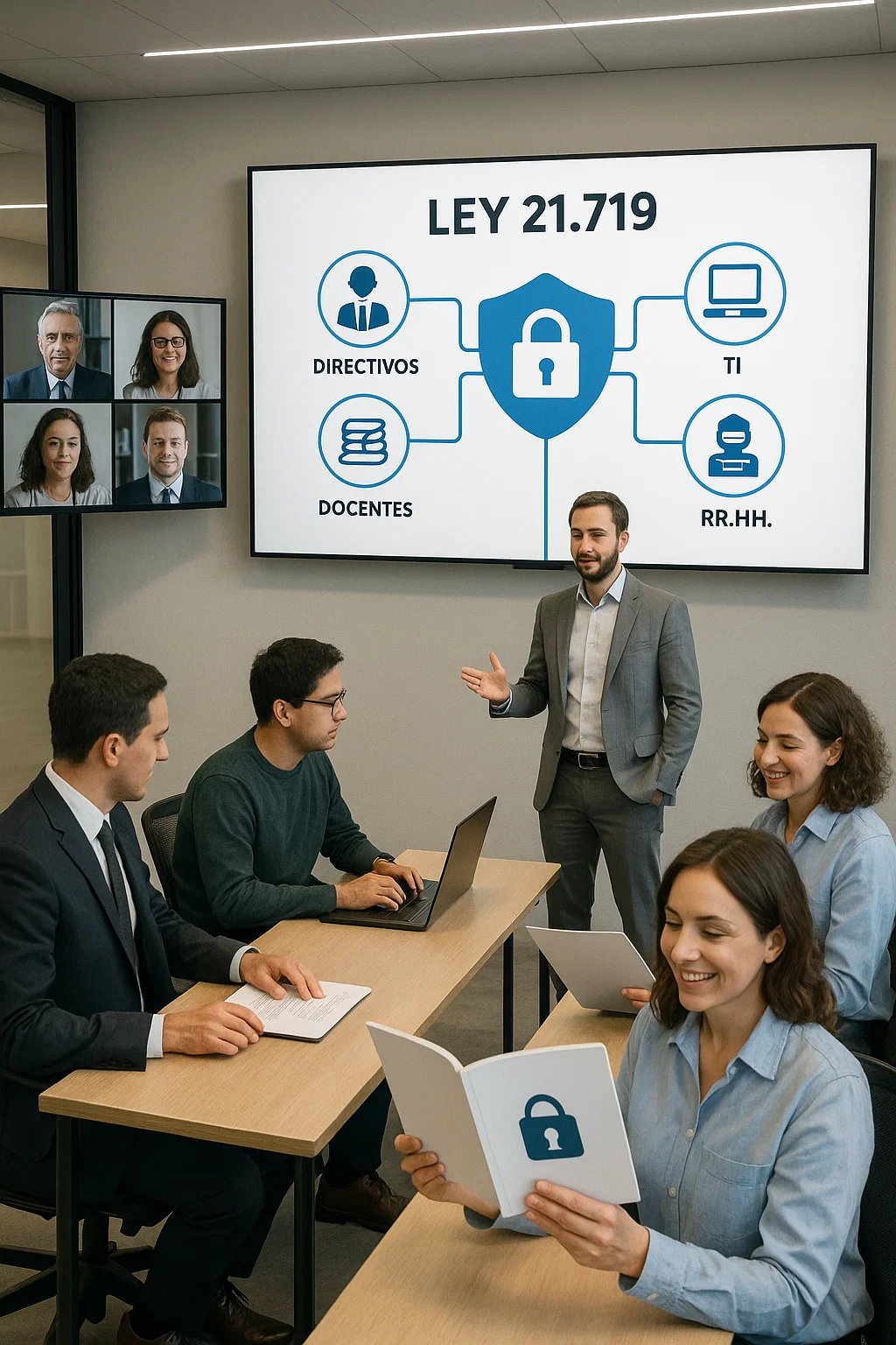 Formaciones por rol (directivos, TI, docentes/operaciones, RR.HH.), con material simple que lleve al cumplimiento de la nueva Ley 21.719